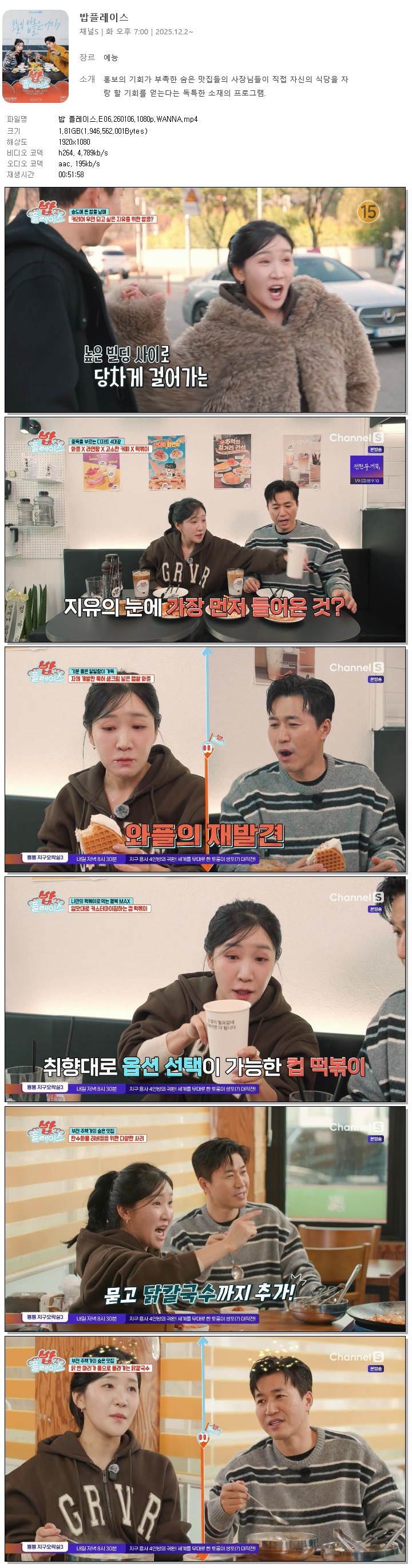 | [채널S] 밥 플레이스.E06.260106.1080p.WANNA[김종민, 김지유].mp4 | 1.8 G | 00:51:58 | 1920x1080 |