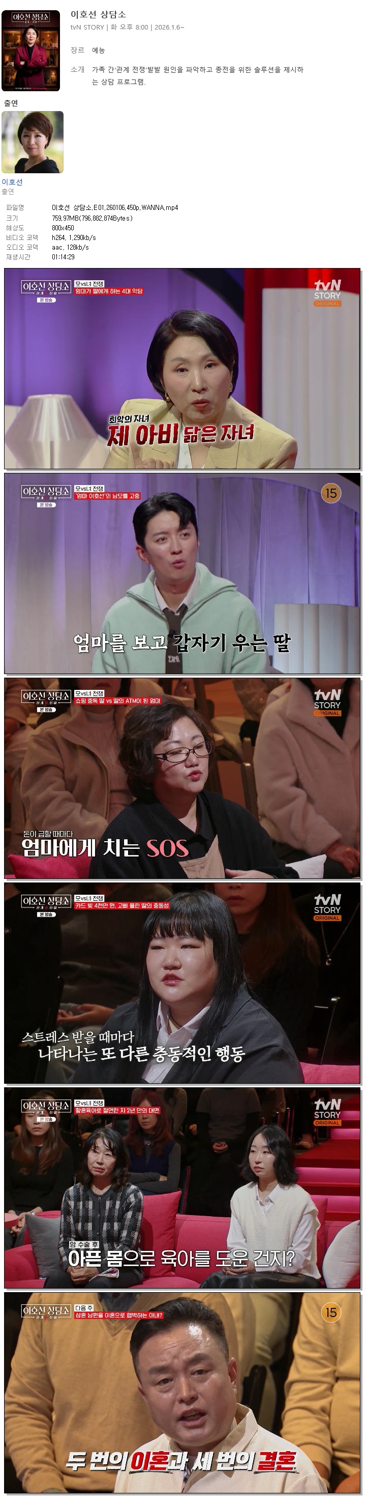 | [TVN STORY] 이호선 상담소.E01.260106.450p.WANNA[이호선].mp4 | 760 M | 01:14:29 | 800x450 |