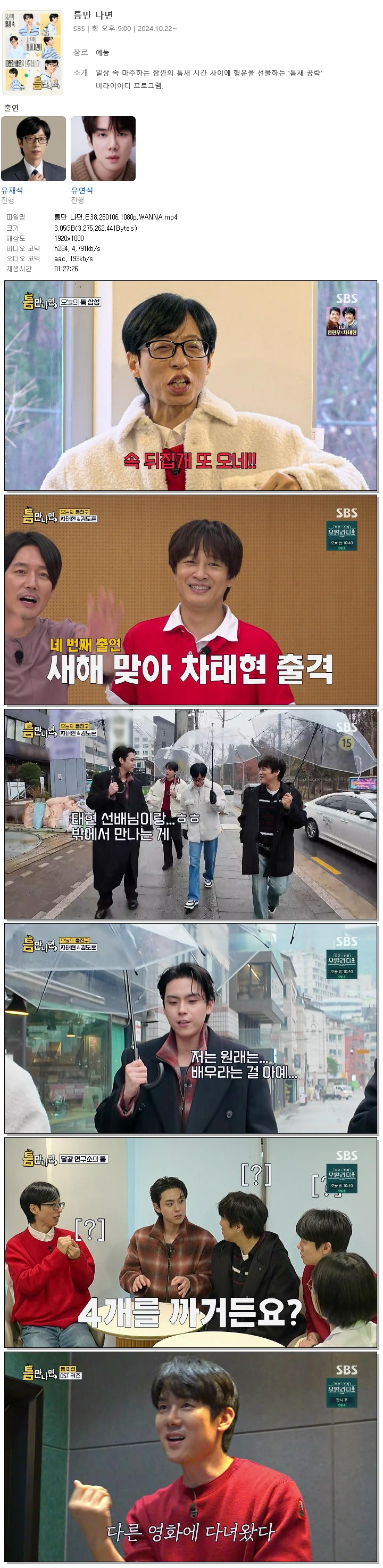 | [SBS] 틈만 나면.E38.260106.1080p.WANNA[김도훈, 차태현].mp4 | 3.1 G | 01:27:26 | 1920x1080 |