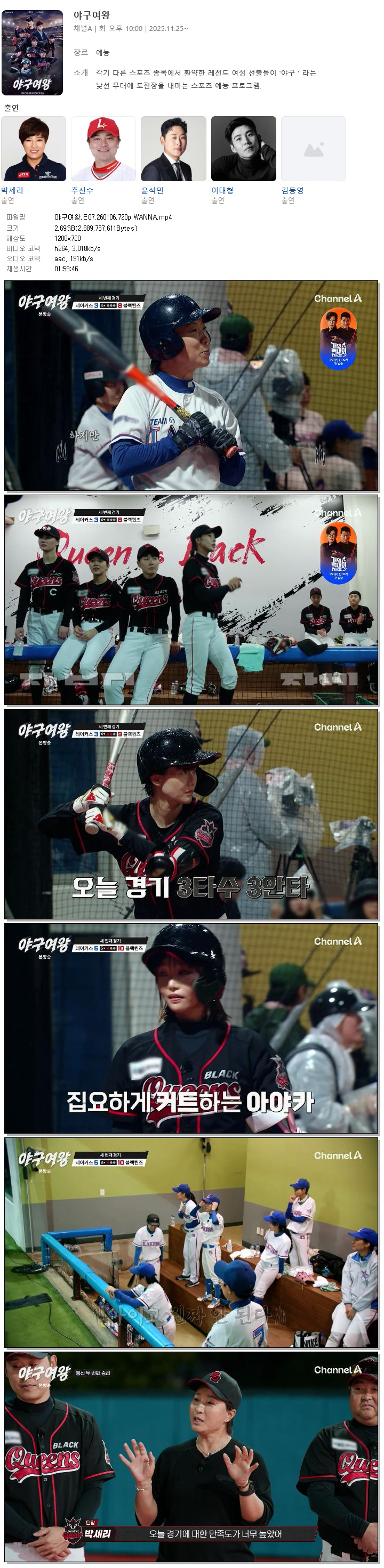 | [채널A] 야구여왕.E07.260106.720p.WANNA[박세리, 추신수].mp4 | 2.7 G | 01:59:46 | 1280x720 |