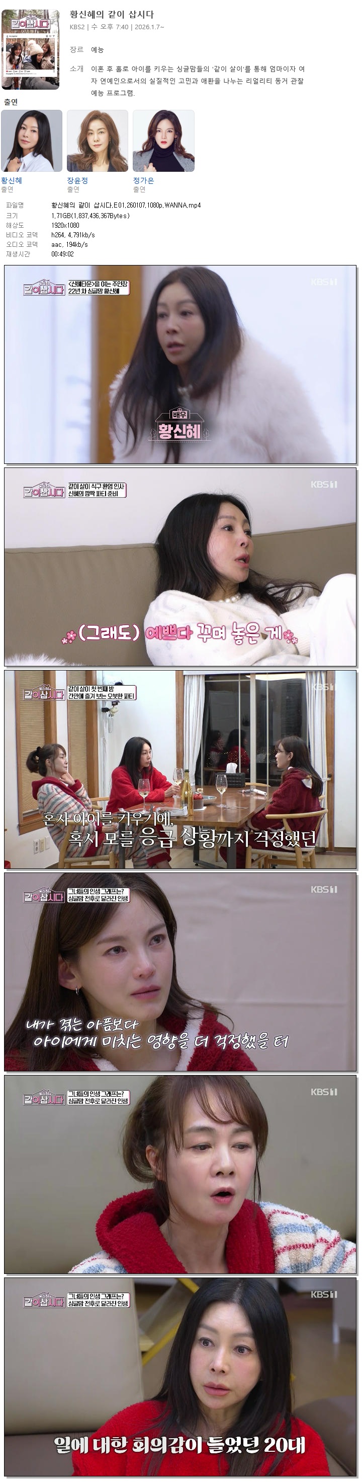 | [KBS1] 황신혜의 같이 삽시다.E01.260107.1080p.WANNA[황신혜, 정가은].mp4 | 1.7 G | 00:49:02 | 1920x1080 |