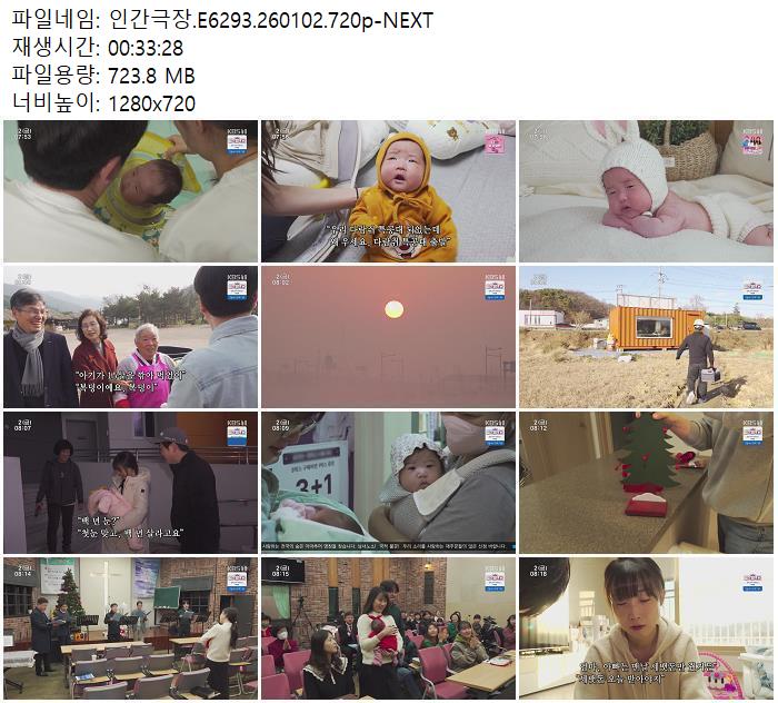 | 인간극장.E6293.260102.720p-NEXT.mp4 | 723.8 M | 00:33:28 | 1280x720 |