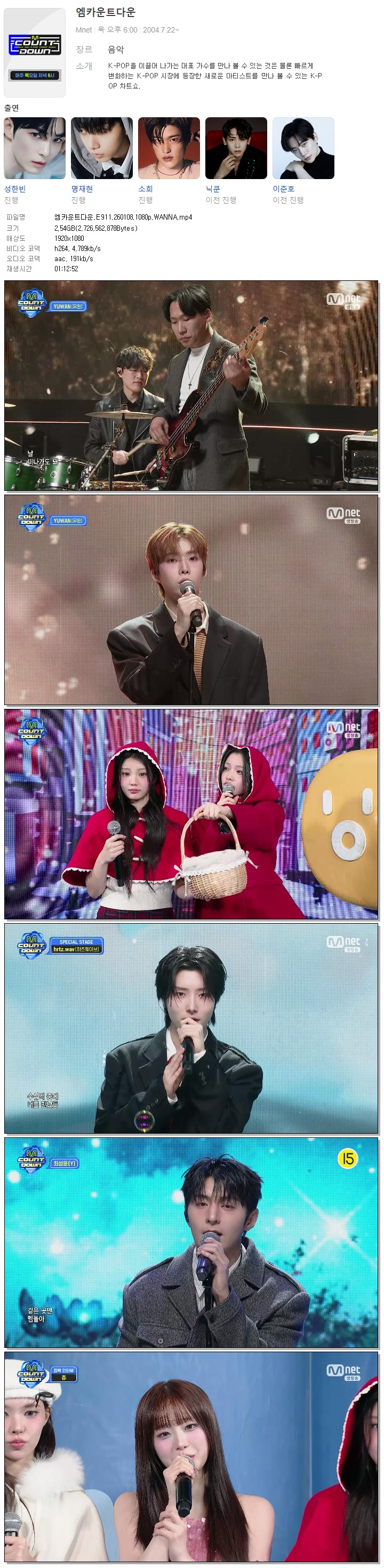 | [M.net] 엠카운트다운.E911.260108.1080p.WANNA[에이핑크, 아일릿].mp4 | 2.5 G | 01:12:52 | 1920x1080 |