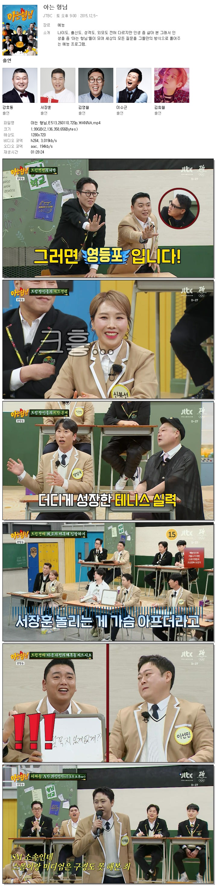 | [JTBC] 아는 형님.E513.260110.720p.WANNA[신봉선, 곽범].mp4 | 2 G | 01:28:24 | 1280x720 |