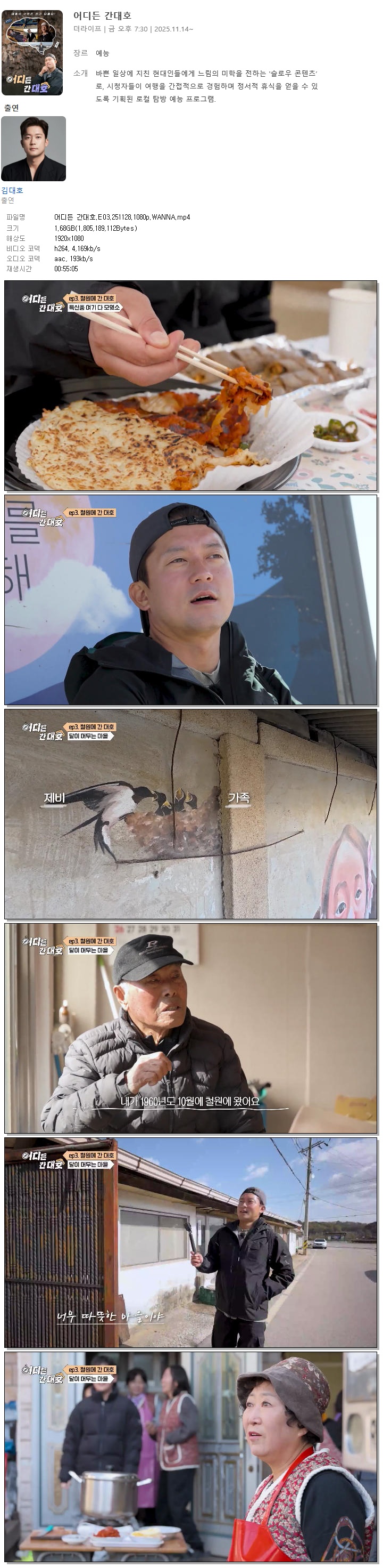 | [더라이프] 어디든 간대호.E03.251128.1080p.WANNA[김대호].mp4 | 1.7 G | 00:55:05 | 1920x1080 |