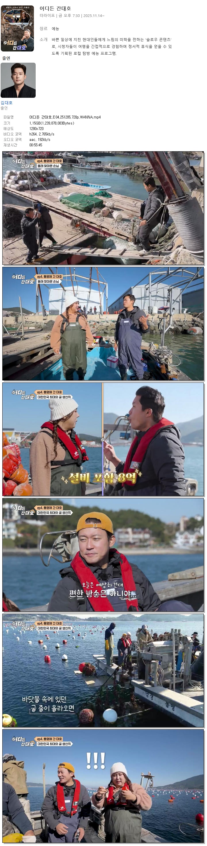 | [더라이프] 어디든 간대호.E04.251205.720p.WANNA[김대호].mp4 | 1.2 G | 00:55:45 | 1280x720 |