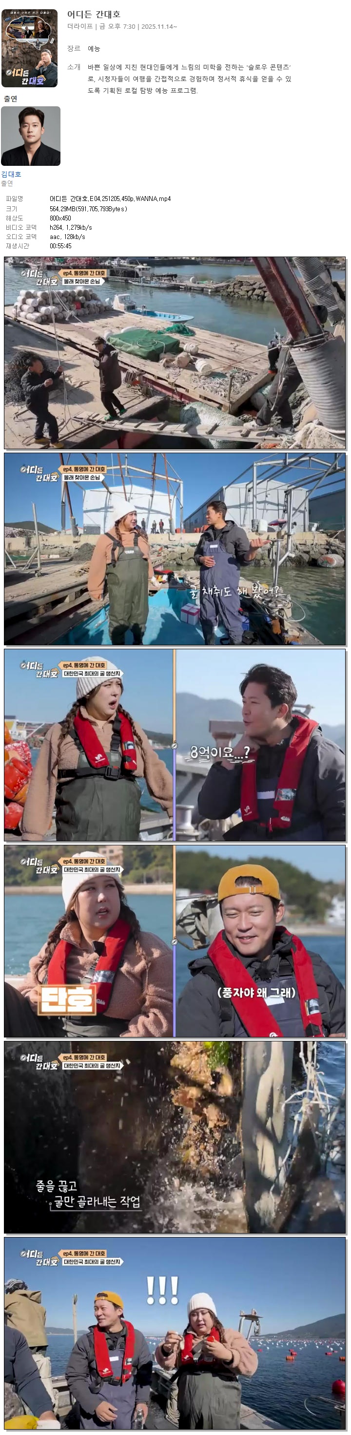 | [더라이프] 어디든 간대호.E04.251205.450p.WANNA[김대호].mp4 | 564.3 M | 00:55:45 | 800x450 |