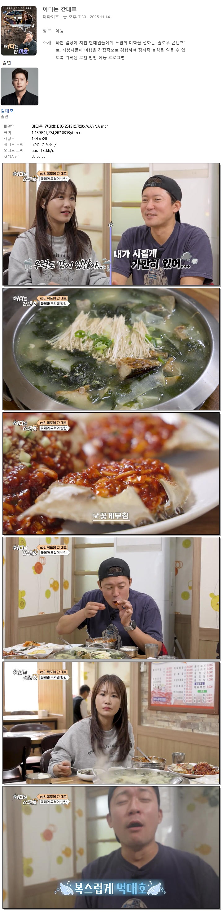 | [더라이프] 어디든 간대호.E05.251212.720p.WANNA[김대호].mp4 | 1.2 G | 00:55:50 | 1280x720 |