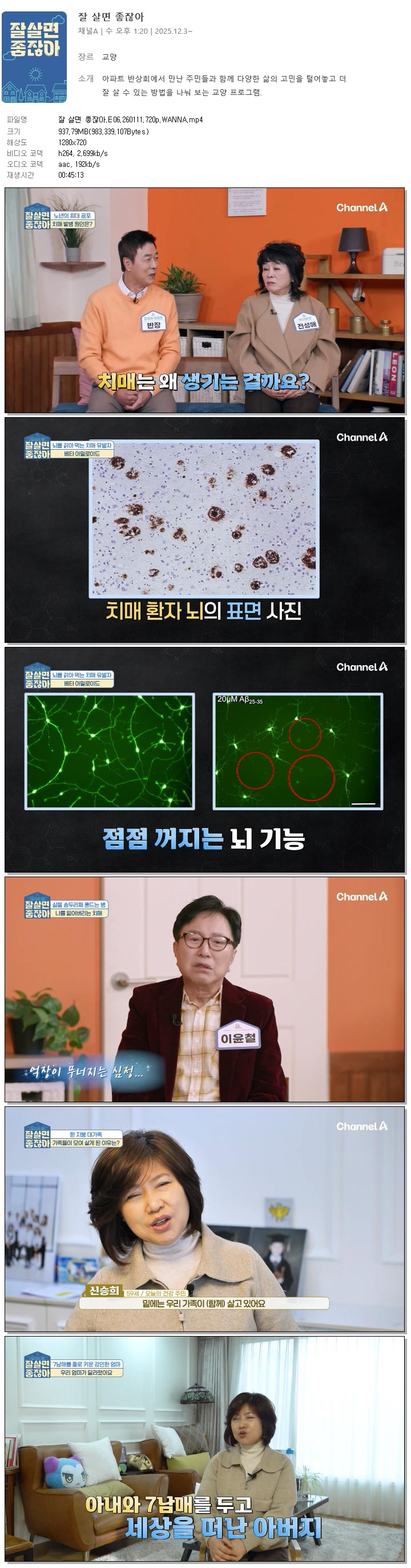 | [채널A] 잘 살면 좋잖아.E06.260111.720p.WANNA[선우재덕, 정미애].mp4 | 937.8 M | 00:45:13 | 1280x720 |