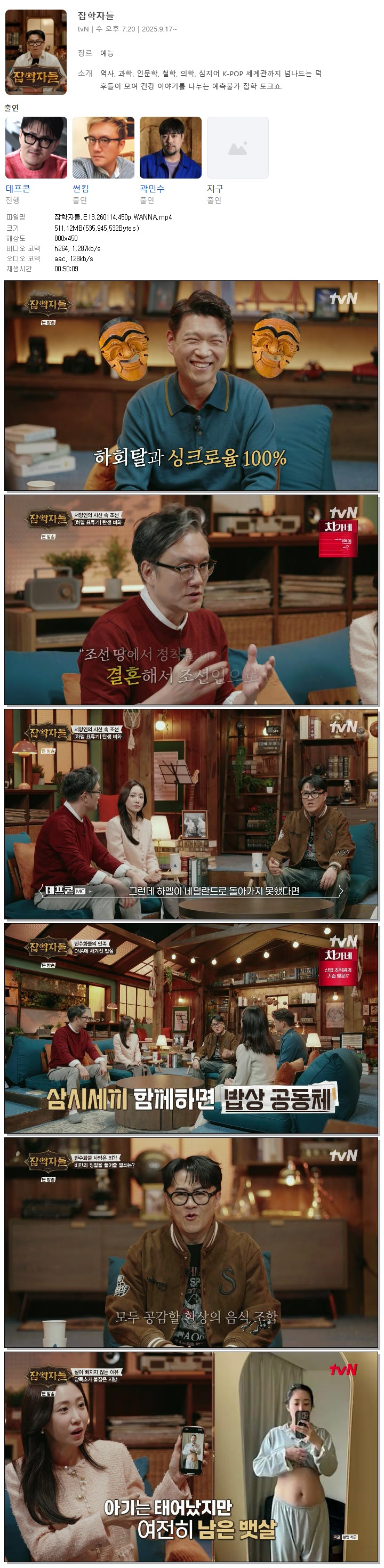 | [TVN] 잡학자들.E13.260114.450p.WANNA[데프콘, 썬킴].mp4 | 511.1 M | 00:50:09 | 800x450 |