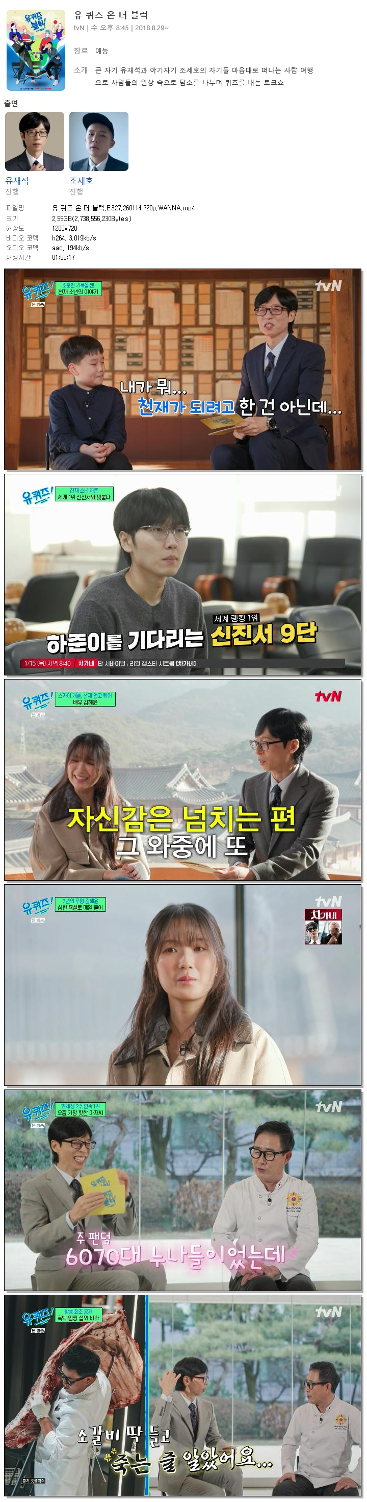 | [TVN] 유 퀴즈 온 더 블럭.E327.260114.720p.WANNA[임성근, 김혜윤].mp4 | 2.6 G | 01:53:17 | 1280x720 |