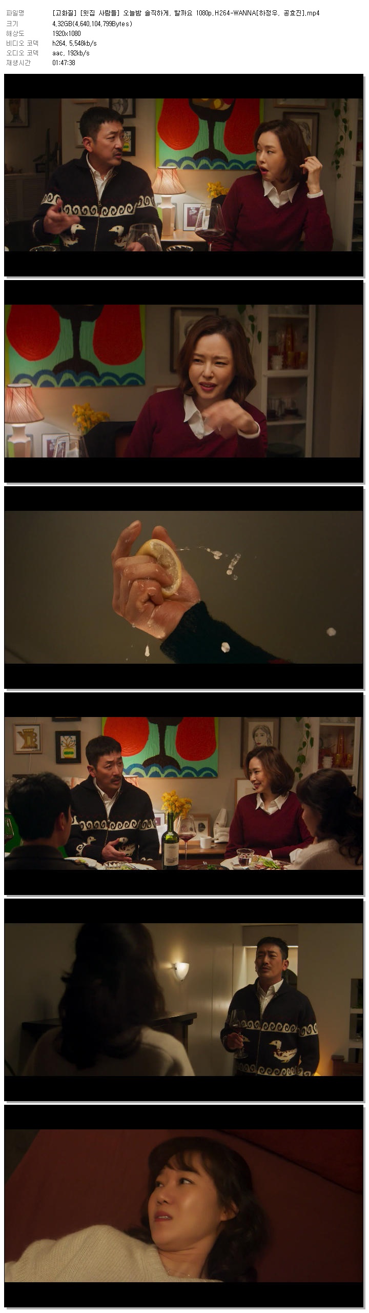 | [고화질] [윗집 사람들] 오늘밤 솔직하게, 할까요 1080p.H264-WANNA[하정우, 공효진].mp4 | 4.3 G | 01:47:38 | 1920x1080 |