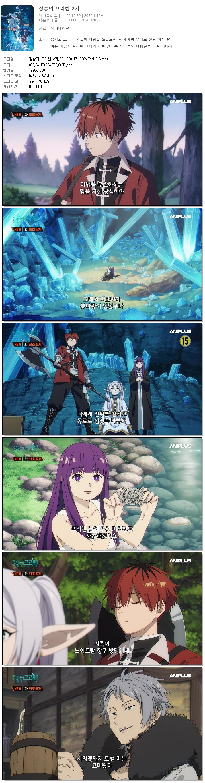 | 장송의 프리렌 2기.E01.260117.1080p.WANNA.mp4 | 862.8 M | 00:24:09 | 1920x1080 |
