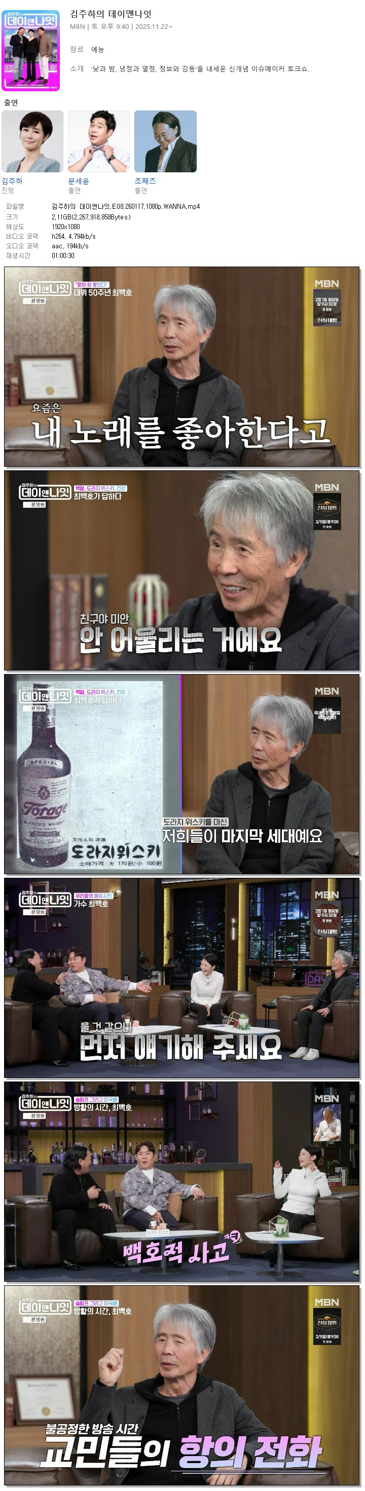 | [MBN] 김주하의 데이앤나잇.E08.260117.1080p.WANNA[최백호].mp4 | 2.1 G | 01:00:30 | 1920x1080 |