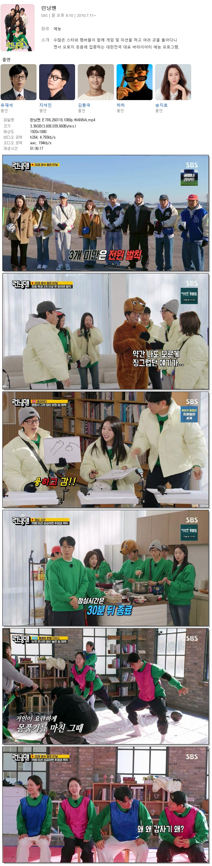 | [SBS] 런닝맨.E786.260118.1080p.WANNA[권은비].mp4 | 3.4 G | 01:36:17 | 1920x1080 |