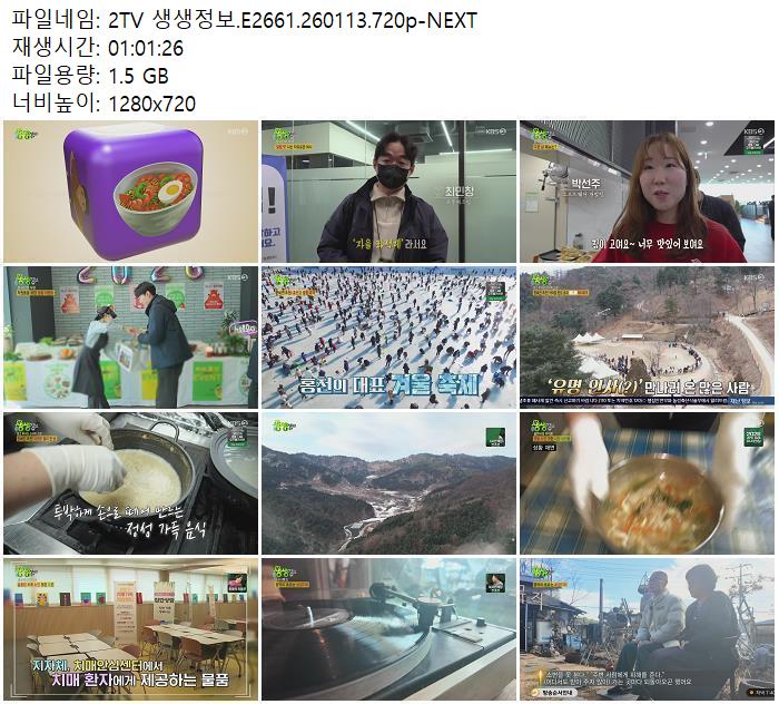 | 2TV 생생정보.E2661.260113.720p-NEXT.mp4 | 1.5 G | 01:01:00 | 1280x720 |