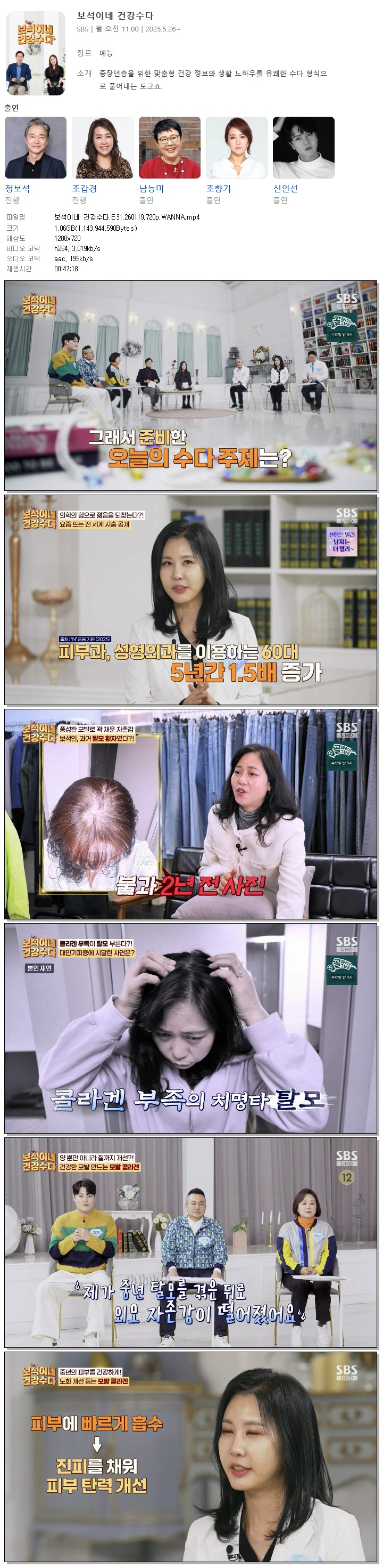 [SBS] 보석이네 건강수다.E31.260119.720p.WANNA[정보석, 조갑경].mp4 1.1 G 00:47:18 1280x720