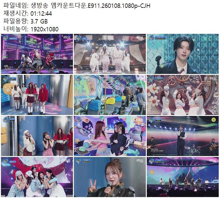 | 생방송 엠카운트다운.E911.260108.1080p-CJH.mp4 | 3.7 G | 01:12:00 | 1920x1080 |
