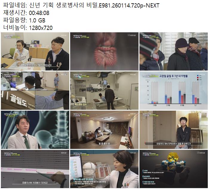 | 신년 기획 생로병사의 비밀.E981.260114.720p-NEXT.mp4 | 1 G | 00:48:08 | 1280x720 |