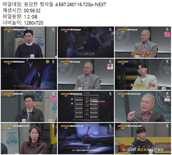 | 용감한 형사들 4.E67.260116.720p-NEXT.mp4 | 1.2 G | 00:56:32 | 1280x720 |