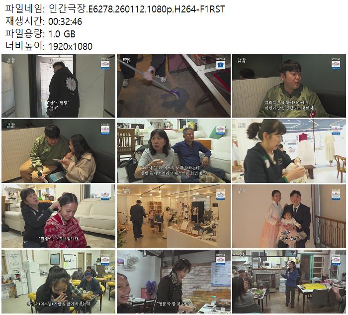 | 인간극장.E6278.260112.1080p.H264-F1RST.mp4 | 1 G | 00:32:46 | 1920x1080 |