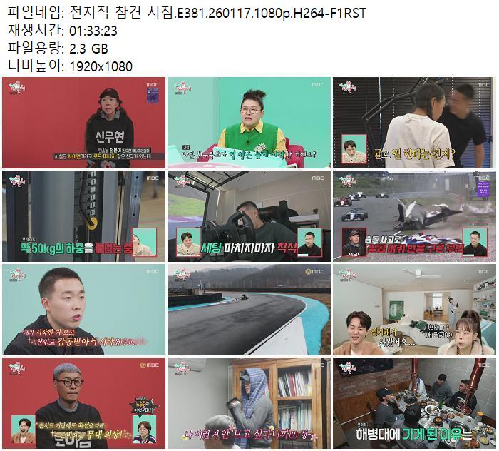 | 전지적 참견 시점.E381.260117.1080p.H264-F1RST.mp4 | 2.3 G | 01:33:00 | 1920x1080 |