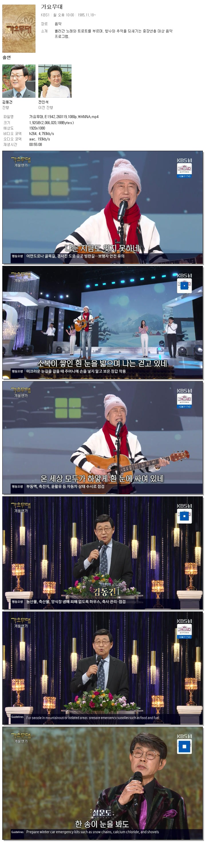 | [KBS1] 가요무대.E1942.260119.1080p.WANNA[전유진, 설운도].mp4 | 1.9 G | 00:55:08 | 1920x1080 |