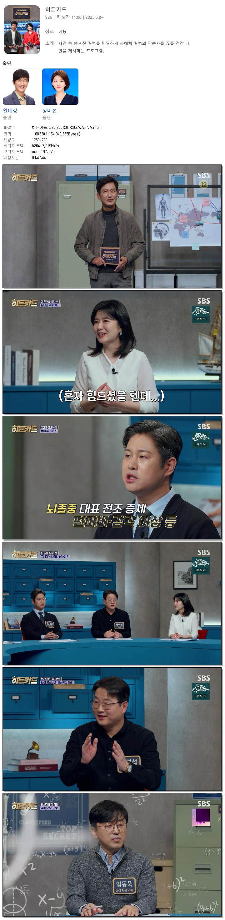 | [SBS] 히든카드.E26.260120.720p.WANNA[안내상, 정미선].mp4 | 1.1 G | 00:47:44 | 1280x720 |
