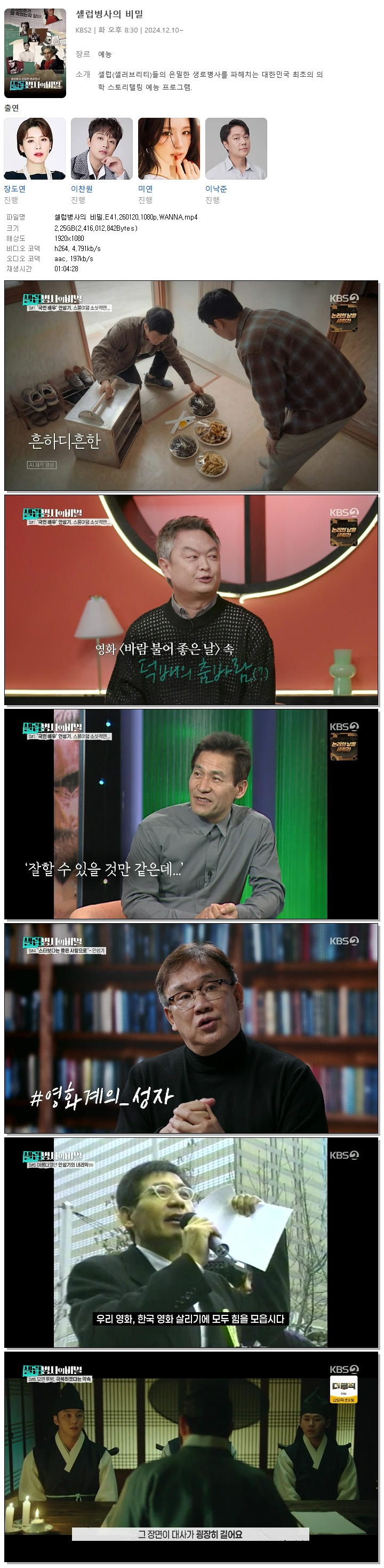 | [KBS2] 셀럽병사의 비밀.E41.260120.1080p.WANNA[장도연, 이찬원].mp4 | 2.3 G | 01:04:28 | 1920x1080 |