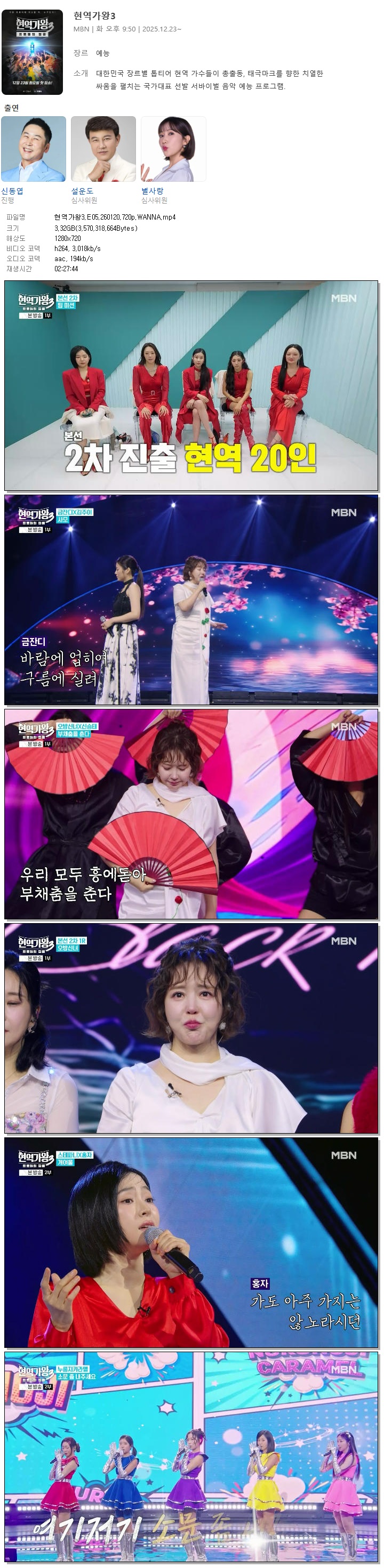 | [MBN] 현역가왕3.E05.260120.720p.WANNA[빈예서, 홍자].mp4 | 3.3 G | 02:27:44 | 1280x720 |