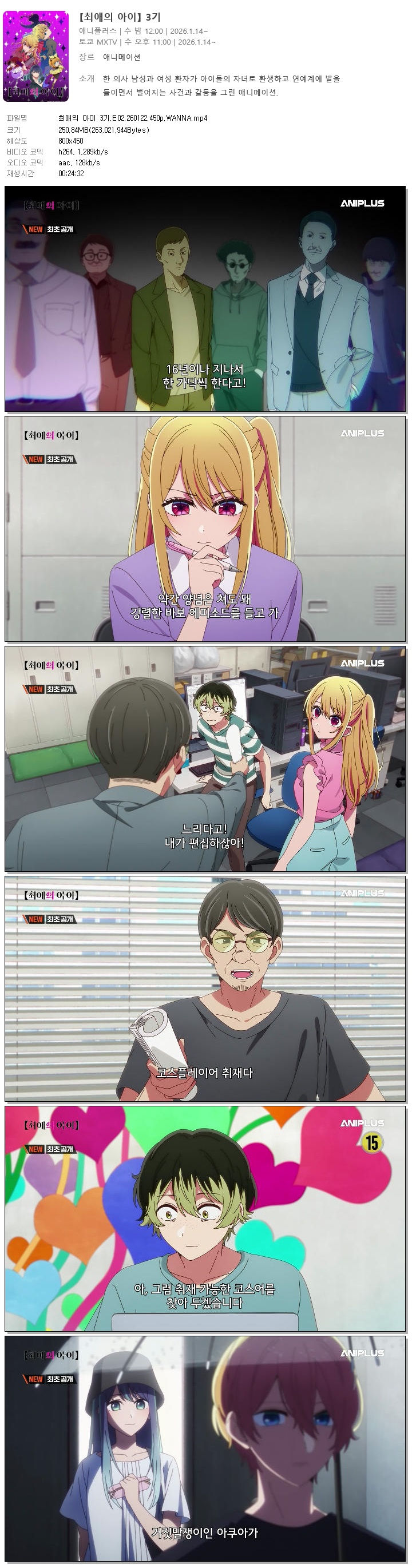| 최애의 아이 3기.E02.260122.450p.WANNA.mp4 | 250.8 M | 00:24:32 | 800x450 |