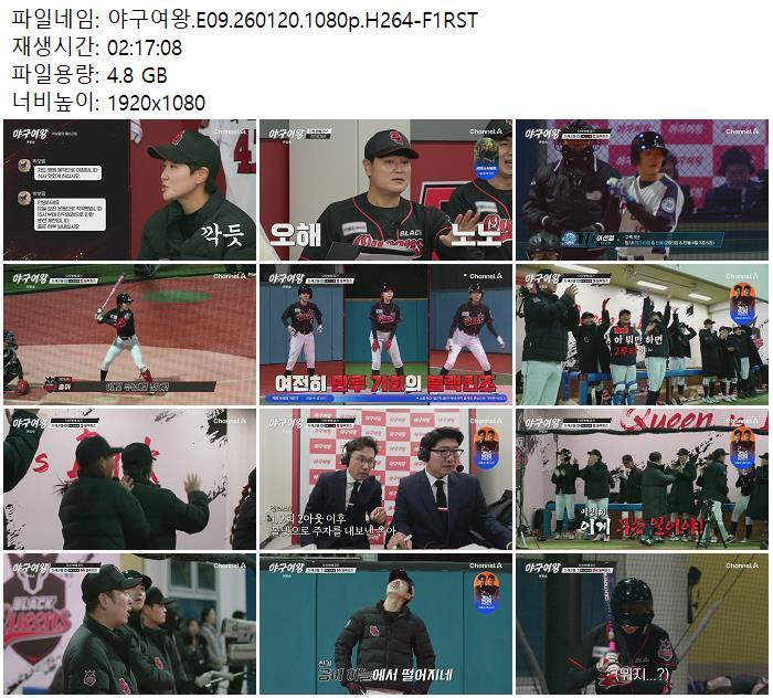 | 야구여왕.E09.260120.1080p.H264-F1RST.mp4 | 4.8 G | 02:17:00 | 1920x1080 |