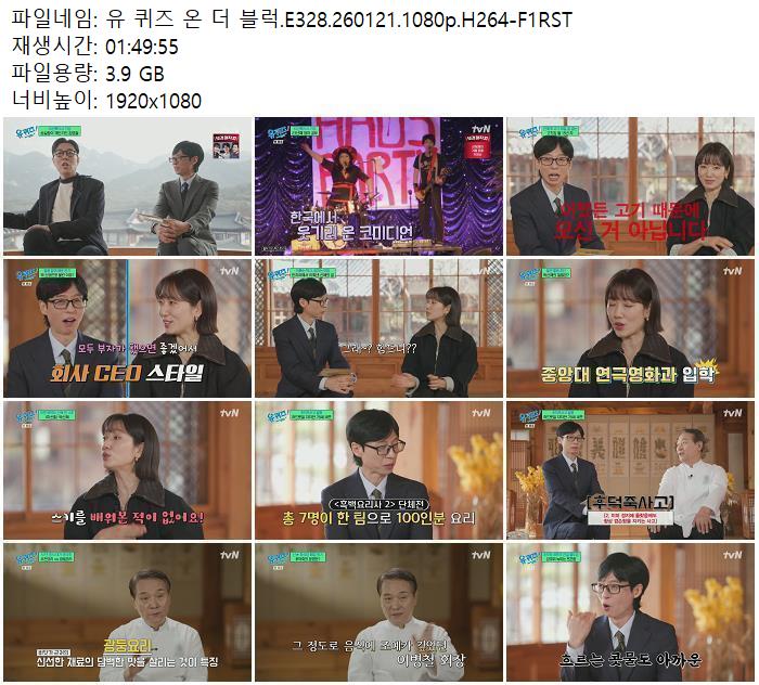 | 유 퀴즈 온 더 블럭.E328.260121.1080p.H264-F1RST.mp4 | 3.9 G | 01:49:00 | 1920x1080 |