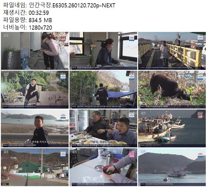 | 인간극장.E6305.260120.720p-NEXT.mp4 | 834.5 M | 00:32:59 | 1280x720 |