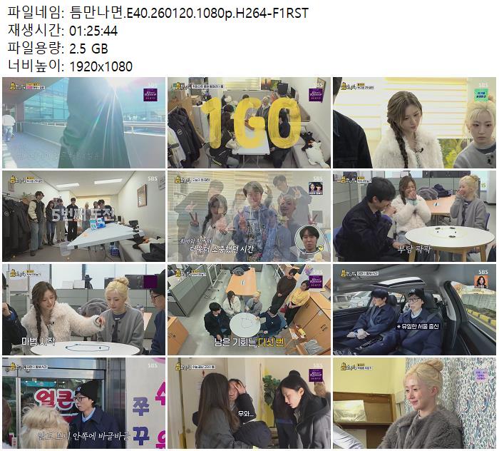 | 틈만나면.E40.260120.1080p.H264-F1RST.mp4 | 2.5 G | 01:25:00 | 1920x1080 |