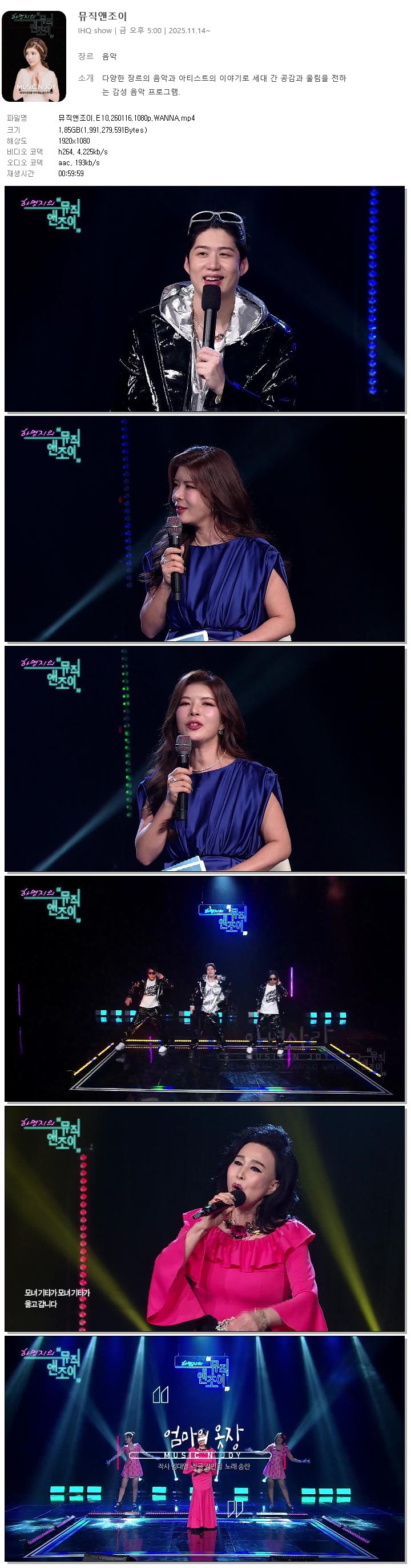 | [i SHOW] 뮤직앤조이.E10.260116.1080p.WANNA[하명지].mp4 | 1.9 G | 00:59:59 | 1920x1080 |