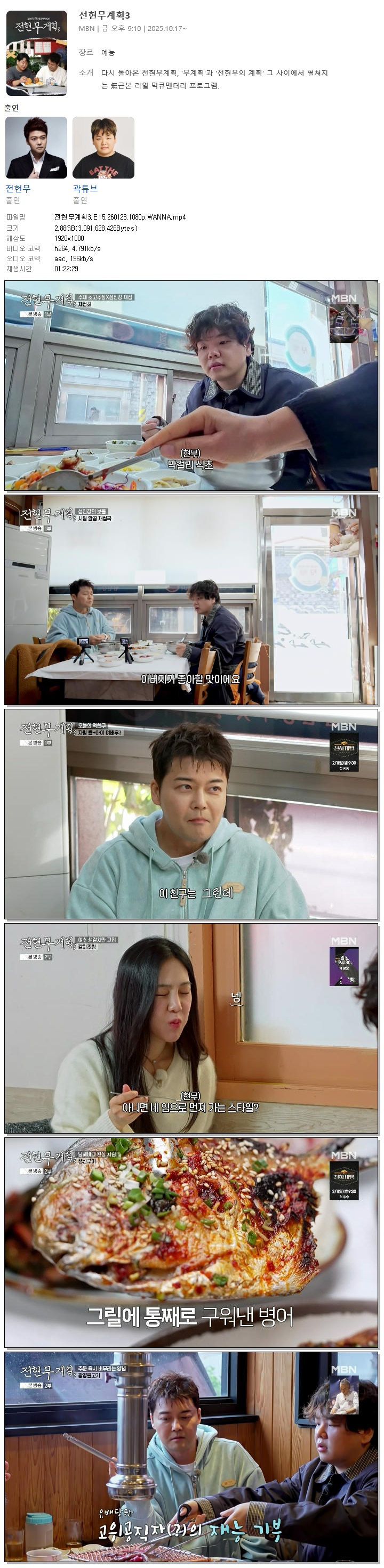 | [MBN] 전현무계획3.E15.260123.1080p.WANNA[한지은].mp4 | 2.9 G | 01:22:29 | 1920x1080 |