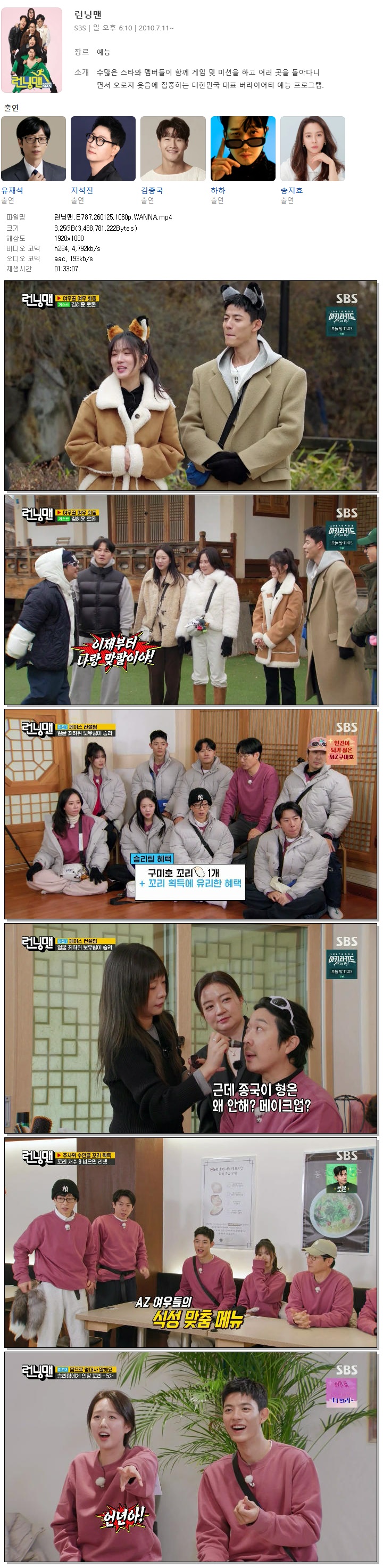 | [SBS] 런닝맨.E787.260125.1080p.WANNA[김혜윤, 로몬].mp4 | 3.2 G | 01:33:07 | 1920x1080 |