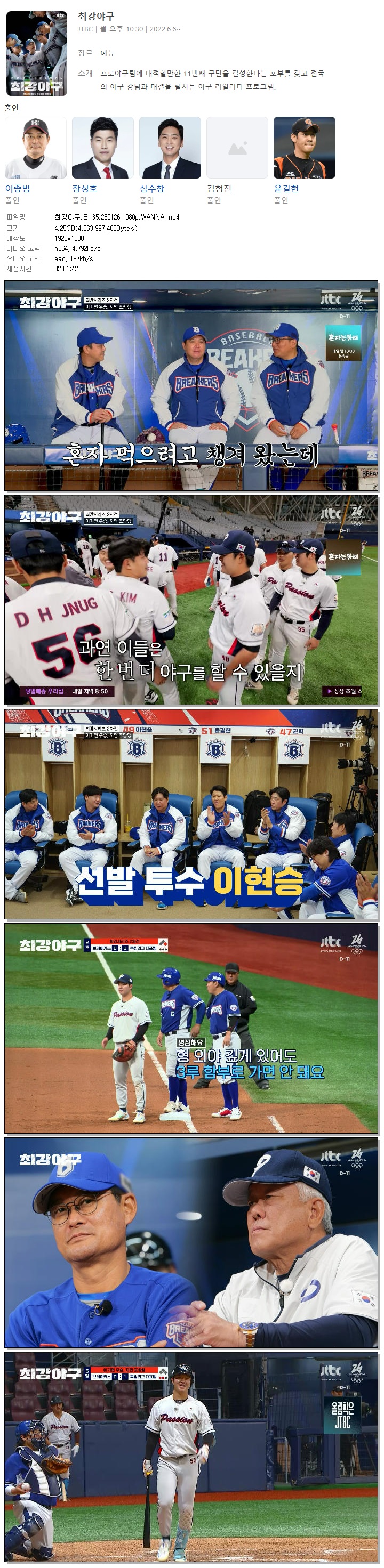 | [JTBC] 최강야구.E135.260126.1080p.WANNA[이종범, 김태균].mp4 | 4.3 G | 02:01:42 | 1920x1080 |