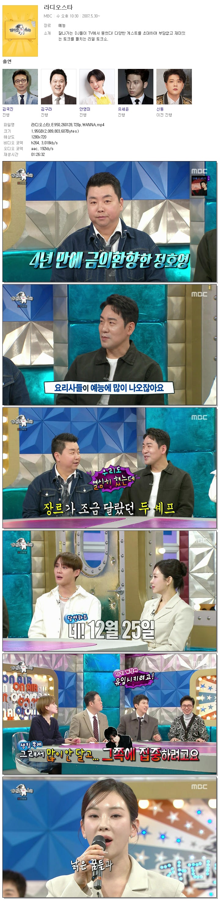 | [MBC] 라디오스타.E950.260128.720p.WANNA[정호영, 김준수].mp4 | 1.9 G | 01:26:32 | 1280x720 |