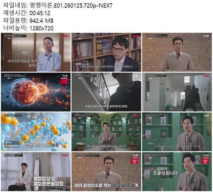 | 평행이론.E01.260125.720p-NEXT.mp4 | 942.4 M | 00:45:12 | 1280x720 |