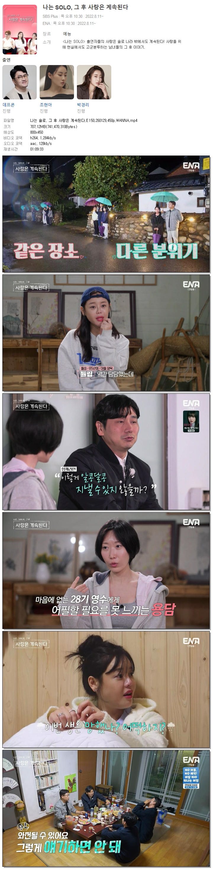 | [ENA] 나는 솔로, 그 후 사랑은 계속된다.E150.260129.450p.WANNA[경리, 보미].mp4 | 707.1 M | 01:09:33 | 800x450 |