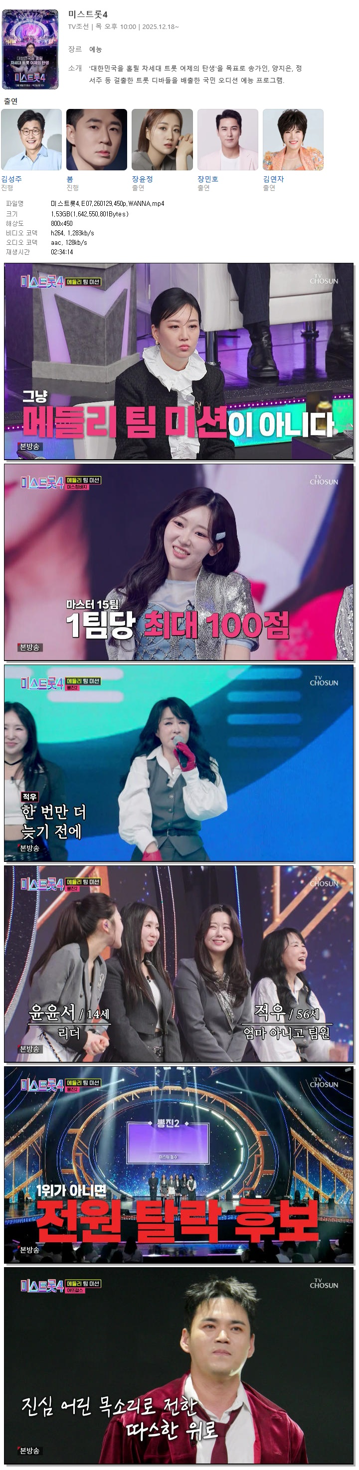 | [TV조선] 미스트롯4.E07.260129.450p.WANNA[김용빈, 천록담].mp4 | 1.5 G | 02:34:14 | 800x450 |