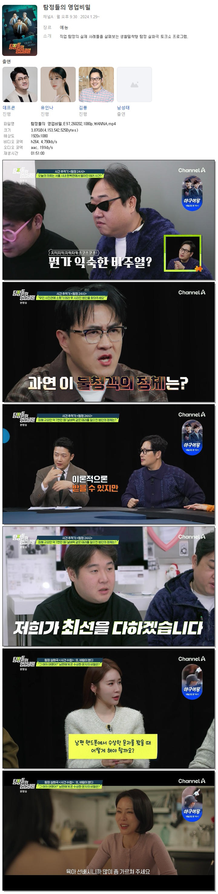 | [채널A] 탐정들의 영업비밀.E97.260202.1080p.WANNA[김영희].mp4 | 3.9 G | 01:51:00 | 1920x1080 |