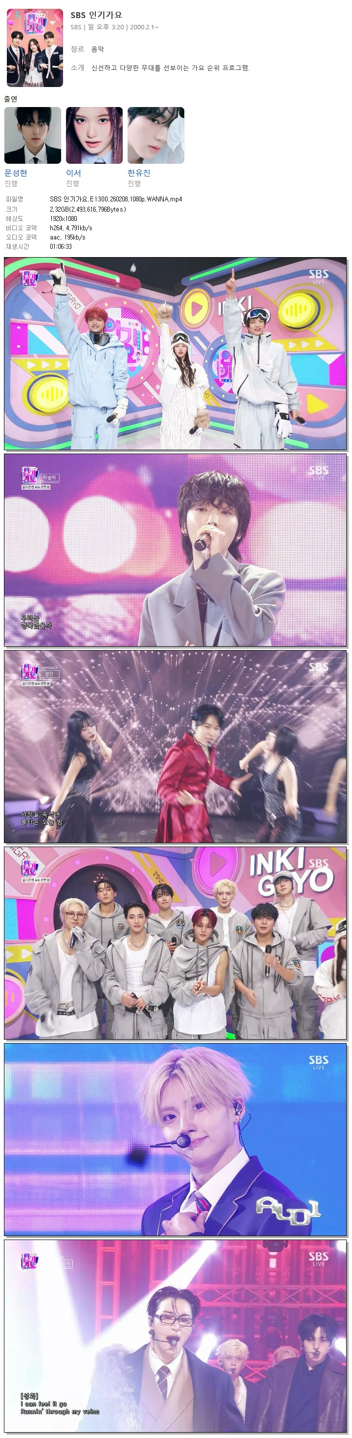 [SBS] SBS 인기가요.E1300.260208.1080p.WANNA[ATEEZ, 임창정].mp4 2.3 G 01:06:33 1920x1080