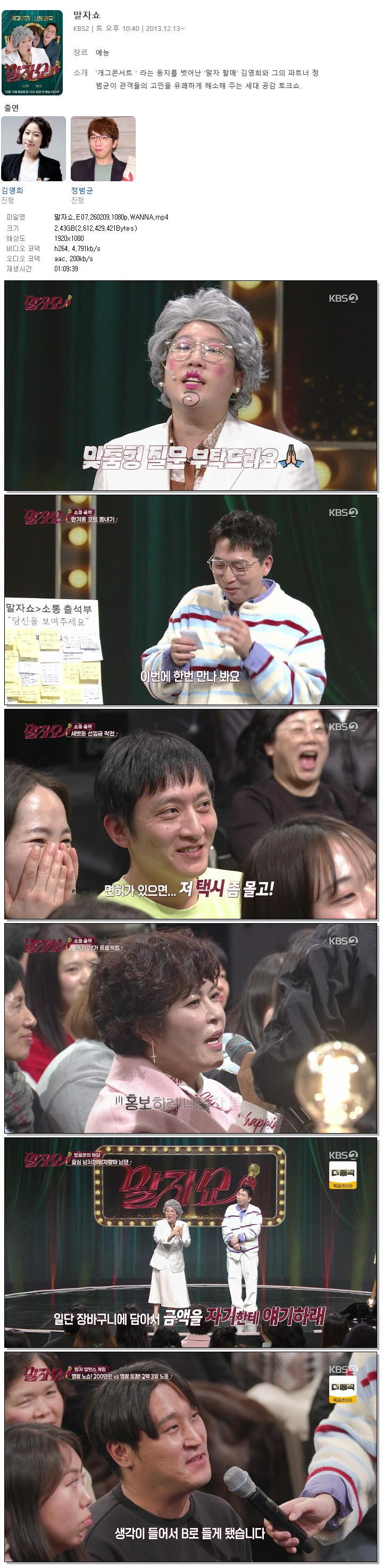 | [KBS2] 말자쇼.E07.260209.1080p.WANNA[김영희, 정범균].mp4 | 2.4 G | 01:09:39 | 1920x1080 |