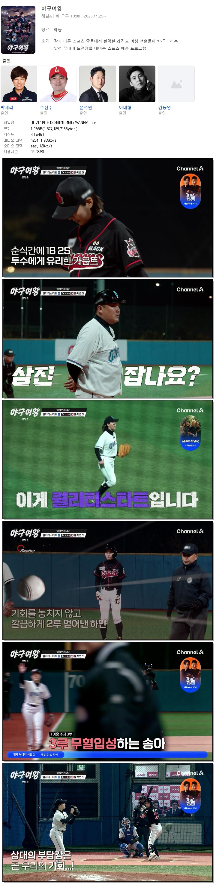 | [채널A] 야구여왕.E12.260210.450p.WANNA[김온아, 신소정].mp4 | 1.3 G | 02:08:53 | 800x450 |