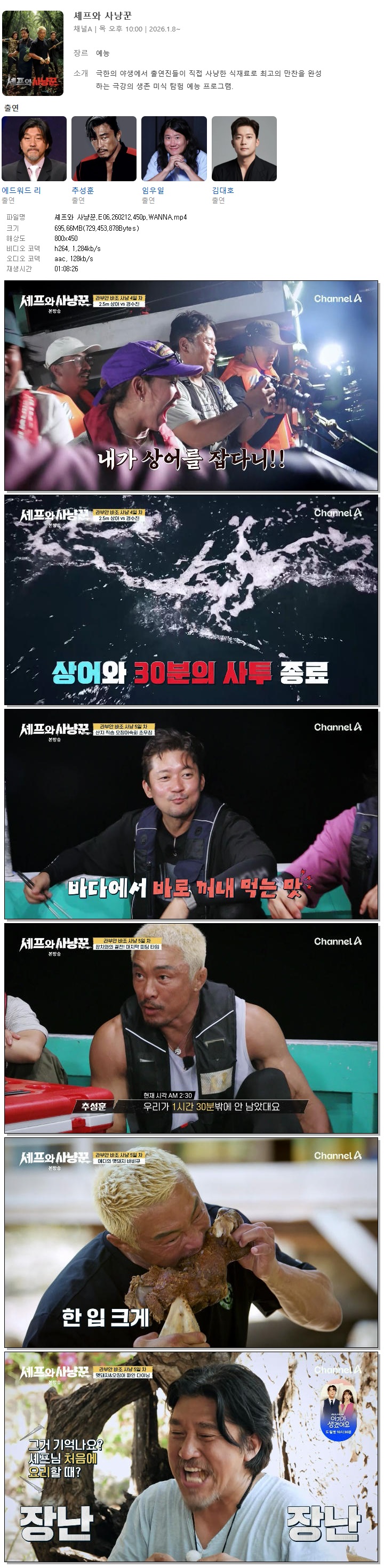 | [채널A] 셰프와 사냥꾼.E06.260212.450p.WANNA[추성훈, 김대호].mp4 | 695.7 M | 01:08:26 | 800x450 |