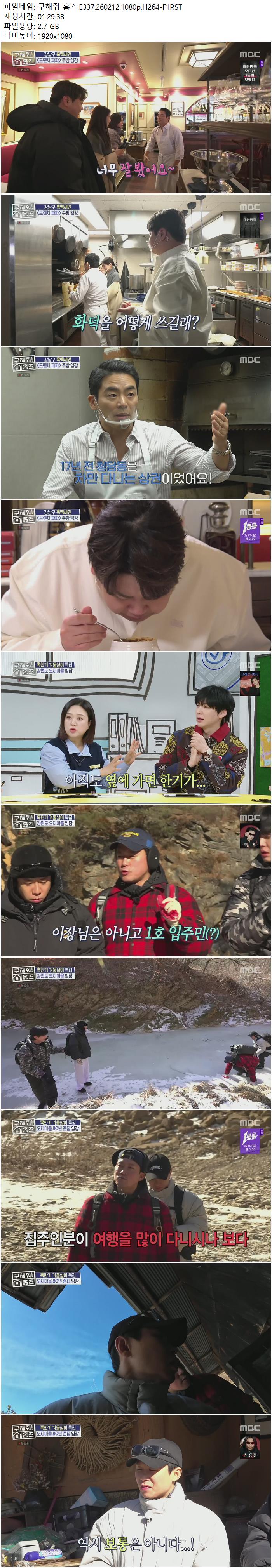 | 구해줘! 홈즈.E337.260212.1080p.H264-F1RST.mp4 | 2.7 G | 01:29:38 | 1920x1080 |
