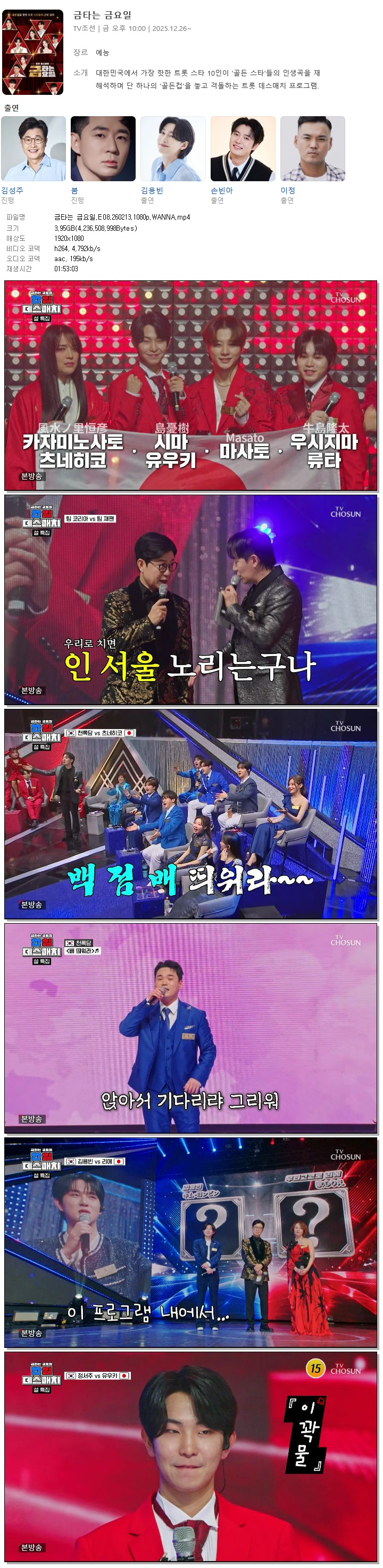 | [TV조선] 금타는 금요일.E08.260213.1080p.WANNA[김용빈, 천록담].mp4 | 3.9 G | 01:53:03 | 1920x1080 |
